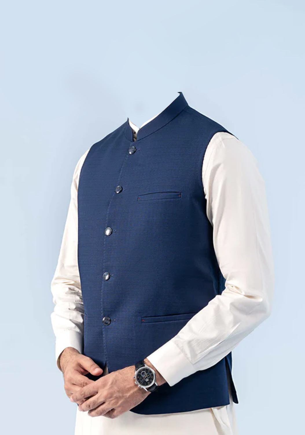 Whether paired with a plain cotton kameez or a formal embroidered suit, the Navy Waistcoat brings elegance and versatility in every stitch.